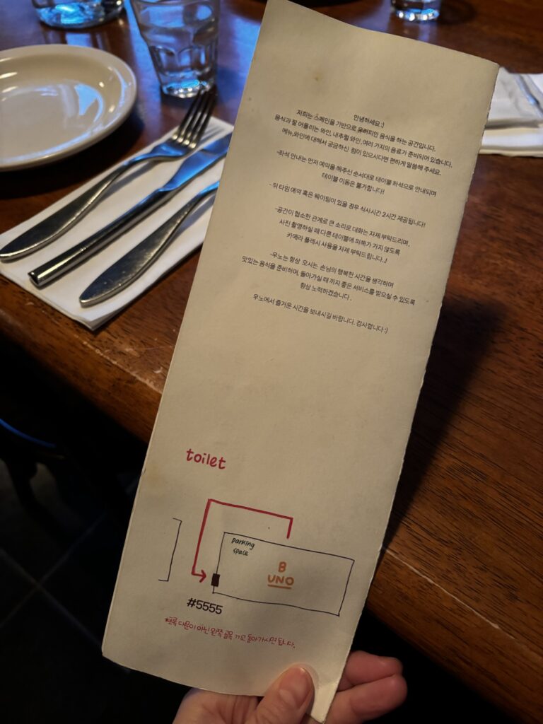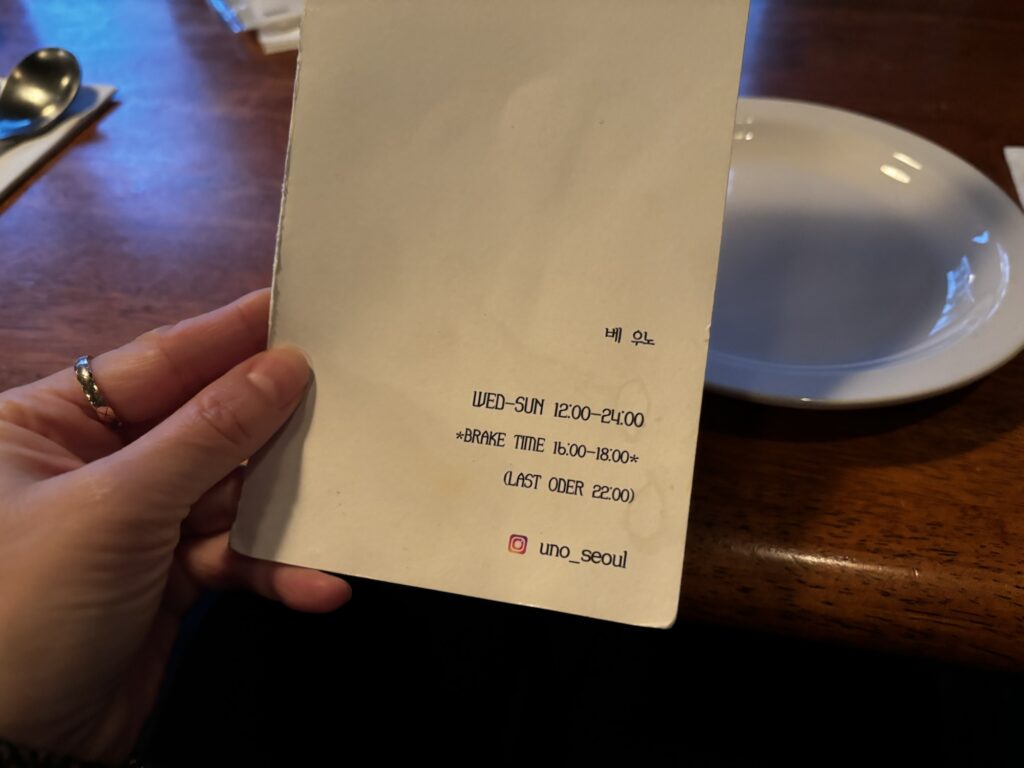 B UNO hardly has a visible sign. Once you leave Mangwon Market, just look for a sleek, all-black one-story building. It’s located right next to Tokyo Bingsu, famous for its tomato shaved ice. Since the space mainly consists of bar seating and only a few tables, I highly recommend making a reservation. They accept bookings through both Naver and CatchTable.