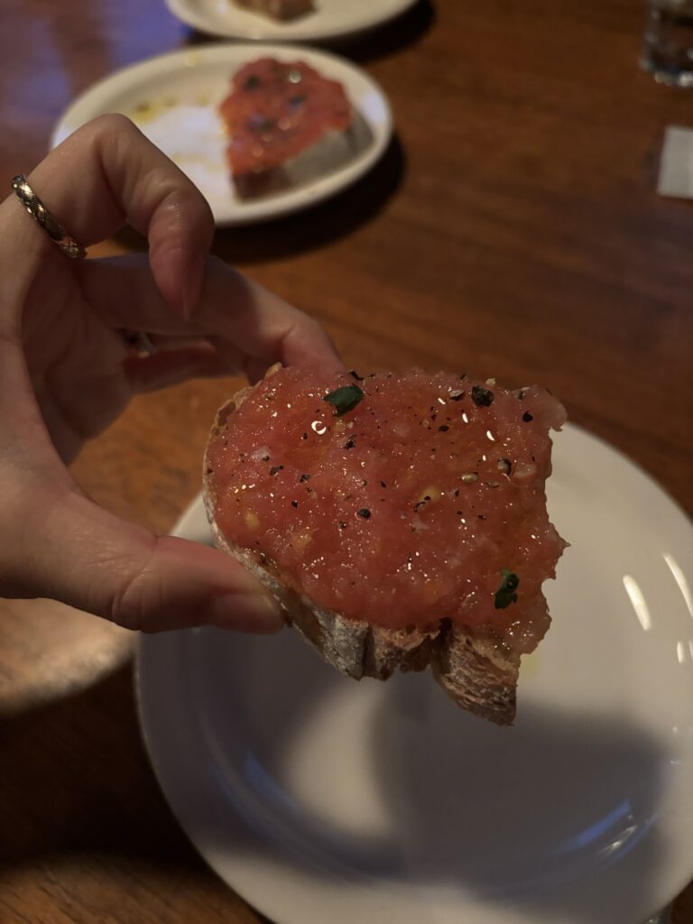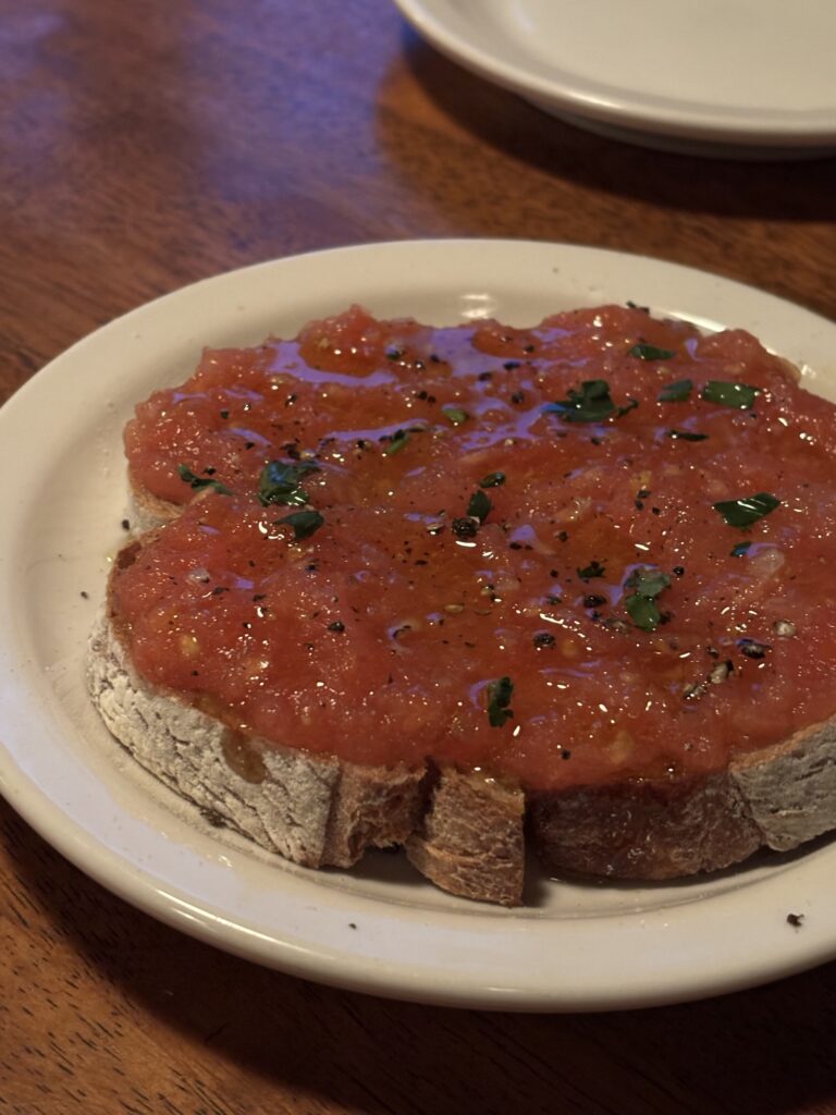 바삭한 깜빠뉴 위에 올리브오일,토마토, 마늘향을 입힌 애피타이저 메뉴.